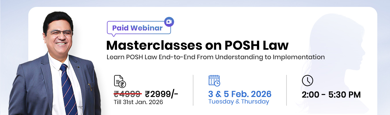 Details: Gain end-to-end mastery through expert-led Masterclasses on POSH Law —covering everything from foundational principles to advanced, real-world implementation. Strengthen your professional credibility while ensuring complete organisational compliance with confidence. What You Will Learn: • POSH Annual Return filing - step by step Guidance• Complaint handling with neutrality & empathy • Investigations, documentation & compliance • Evidence Evaluation Why Join the Paid Webinar? • 2 LIVE classes on 3rd & 5th February 2026 (2 p.m. to 5.30 p.m.) • Certificate of participation • Vouchers worth ₹5000 (KAPGROW services & Masterclasses)